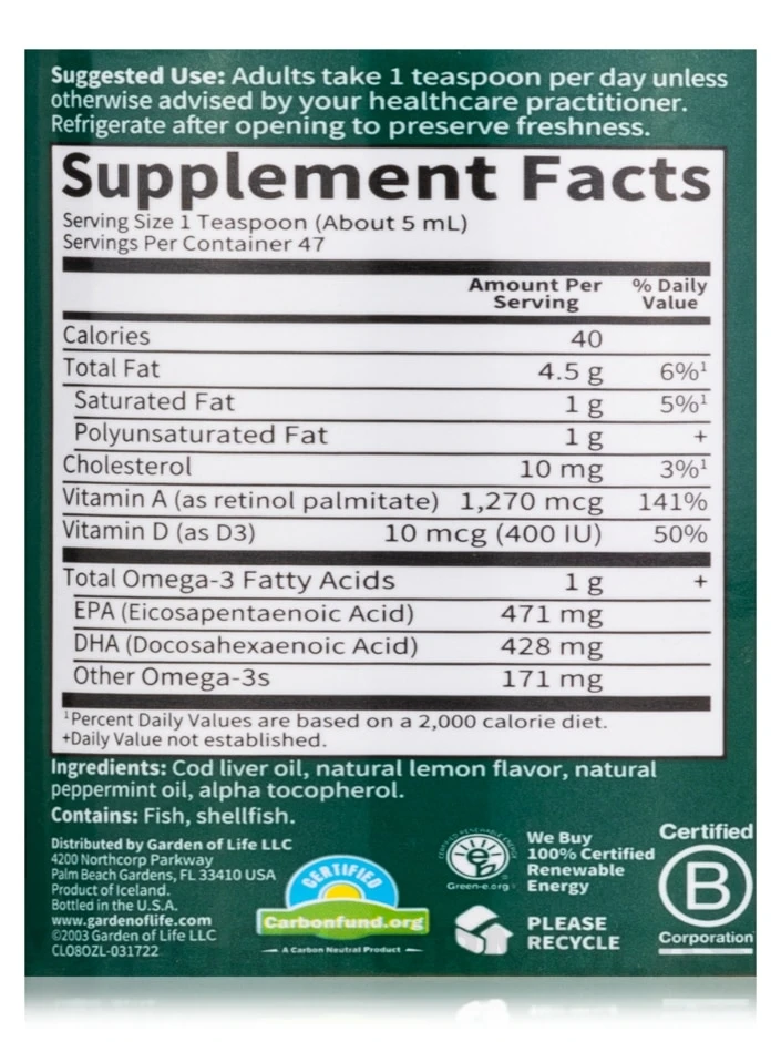 Get the best of the cold waters of Iceland with Olde World Icelandic Cod Liver Oil, processed using traditional methods. Just one teaspoon of lemon mint oil contains 1.4g of Omega-3 Fatty Acids, along with 4,500 IU of Vitamin A and 450 IU of Vitamin D – all the goodness you need in one dose.